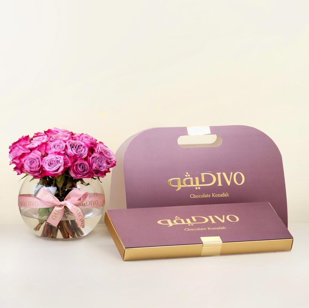 بوكس كنافة الشوكولاتة البلجيكية الفاخرة، بـ 30 قطعة محشوة بنكهات لذيذة (لوتس – فستق – بندق) ومغطاة بالشوكولاتة الذائبة 🤎، يجي مع فازة ورد جوري طبيعي – 20 وردة تضيف لمسة حب ورقي تخلي البوكس مختلف بكل تفاصيله 🌹.